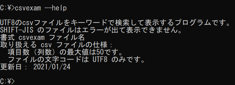 csvexam -h または csvexam --help と入力すると、簡単な説明が表示されます。