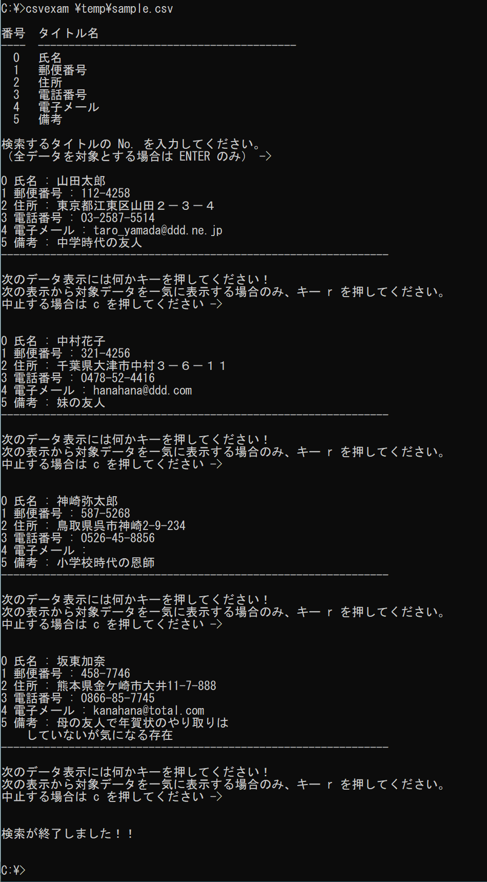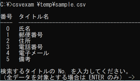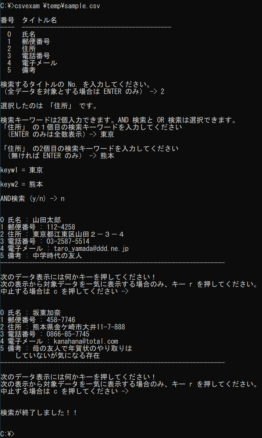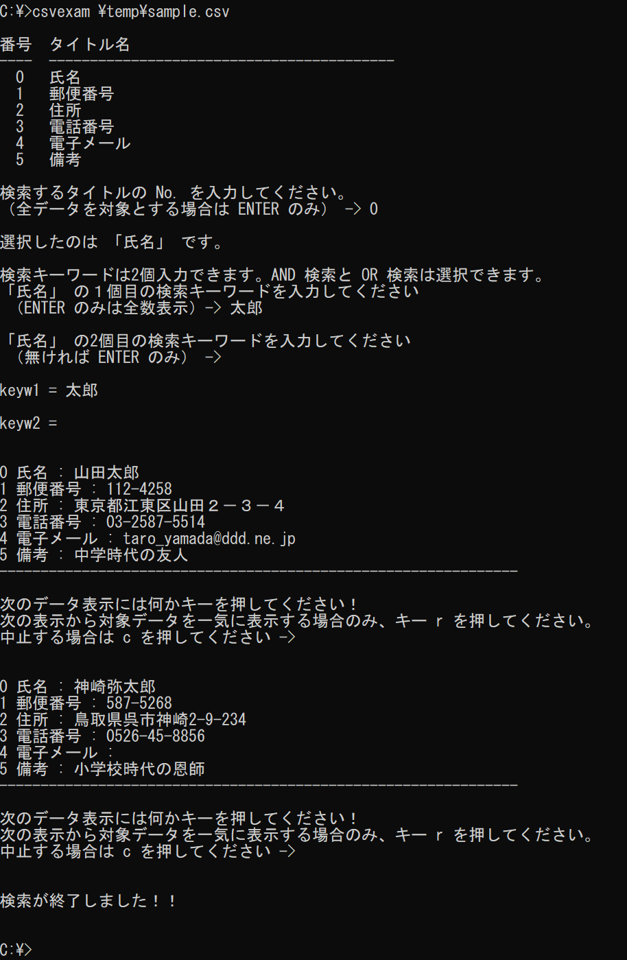 csvexam.exe は csv ファイルをデータとして利用してキーワードで検索し、その結果を表示するユーティリティーです。
