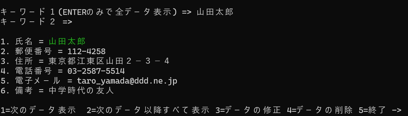 となって、修正する項目を聞いてくるので、データ項目の番号を入力します。